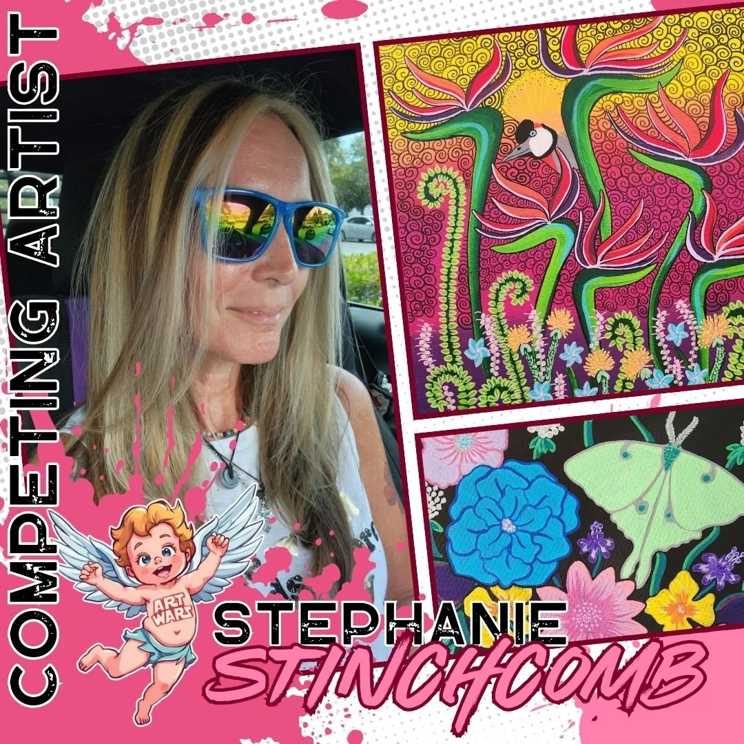 We’re thrilled to welcome Steph into the arena for the Valentine’s Day Edition of ART WARS 2026! Born and raised in West Palm Beach, Steph is a powerhouse creative with a BFA in Studio Art (Photography) from FAU and currently serves as a K–12 art teacher for the School District of Palm Beach County. Her artistic footprint spans all of South Florida, with features at The Box Gallery, Lake Worth Street Painting Festival (7 years strong), FDOT Traffic Box Wraps, Howley’s, Hatch 1121, PBAU, The Boca Museum, The South Florida Fair, and countless galleries, murals, and public art projects throughout the region. With deep community roots and serious creative fire, Steph returns ready to paint live and bring experience, passion, and bold energy back to the Art Wars battlefield!