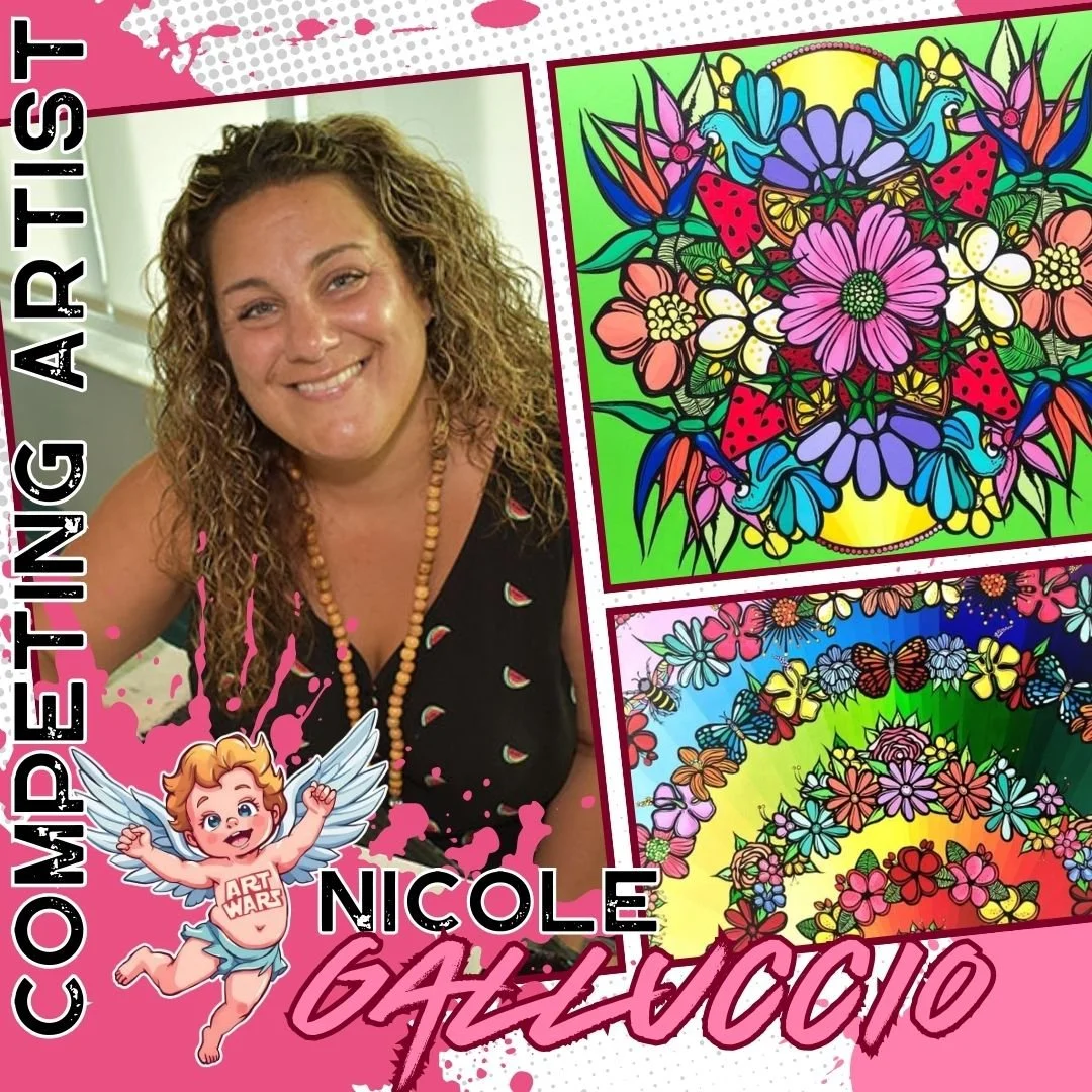 We’re thrilled to welcome Nicole Galluccio back into the arena for the Valentine’s Day Edition of ART WARS 2026! A powerhouse South Florida artist, Nicole is known for her bold, layered pop-art style and instantly recognizable visual voice. Her work explodes with color, pattern, and energy—blending retro nostalgia with contemporary edge to transform everyday imagery into vibrant, unforgettable stories. Featured in galleries, public spaces, and exhibitions throughout South Florida, Nicole returns ready to paint live and unleash her electric creativity once again on the Art Wars battlefield!